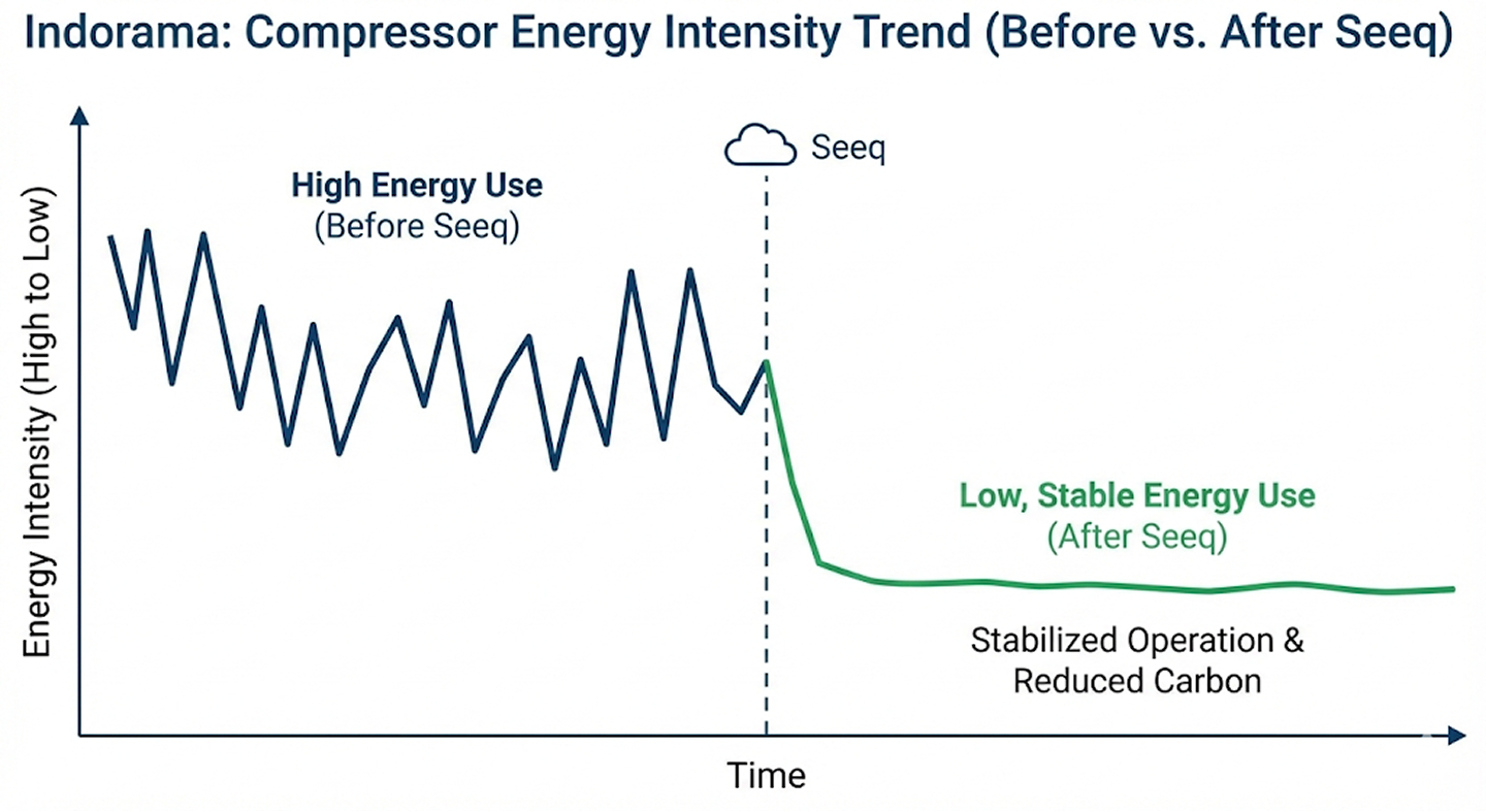 Indorama implemented an advanced analytics environment by connecting multiple process historians into Seeq, enabling continuous, contextualized monitoring of compressor performance.